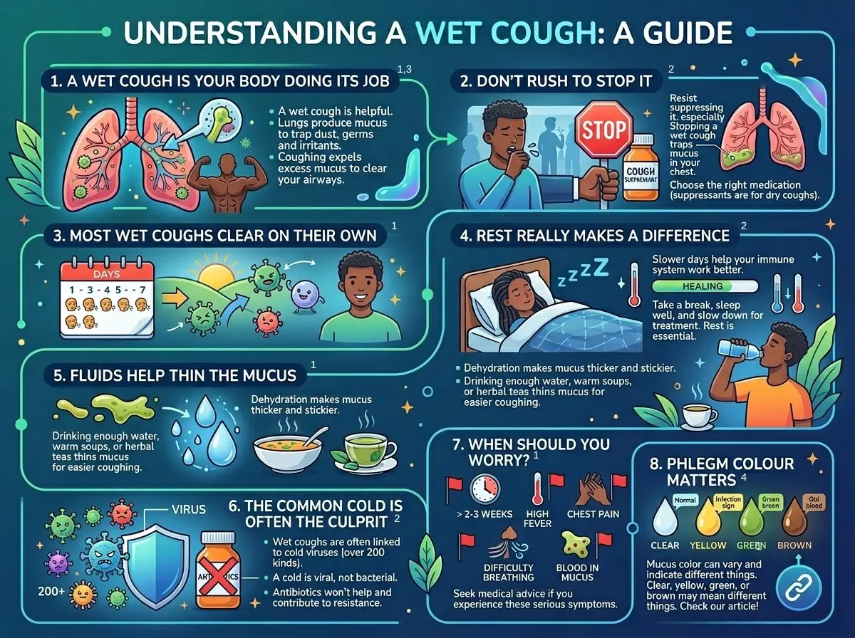 It’s tempting to suppress a cough, especially at work, school, or in public. But stopping a wet cough too quickly can mean mucus stays trapped in your chest. If you’re using medication, make sure it’s the right type. Cough suppressants are usually better for dry coughs, not wet ones.