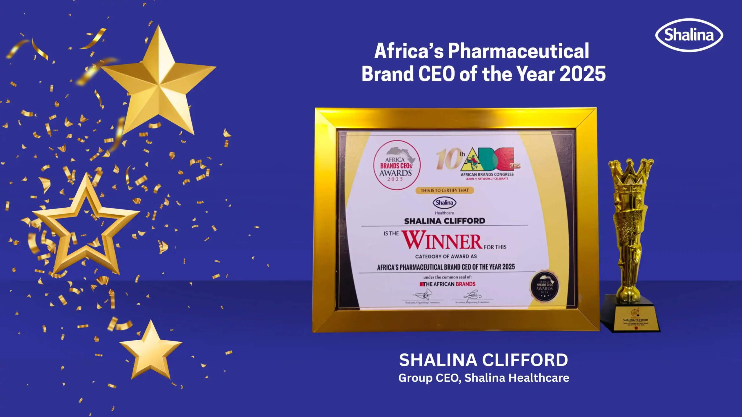 We are delighted to share that our Group CEO, Ms. Shalina Clifford, has been honored as Africa’s Pharmaceutical Brand CEO of the Year 2025 at the 10th Edition of the African Brands Congress, held in Lagos, Nigeria.